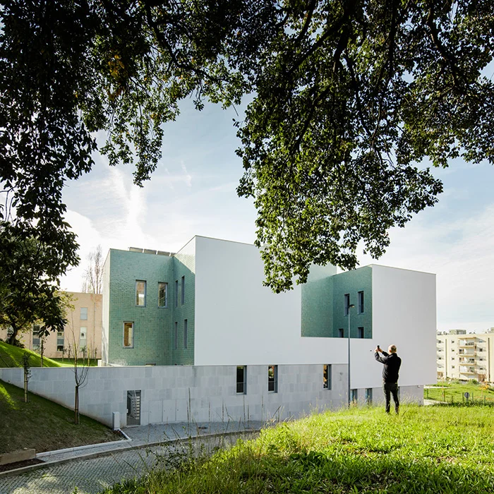 Através destas novas frentes de rua qualificadas, potencializamos o sentido urbano deste edifício que culmina o loteamento existente e estabelecemos também uma privilegiada relação visual com as zonas rurais envolventes.